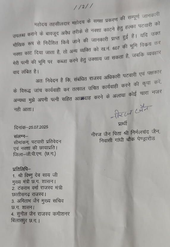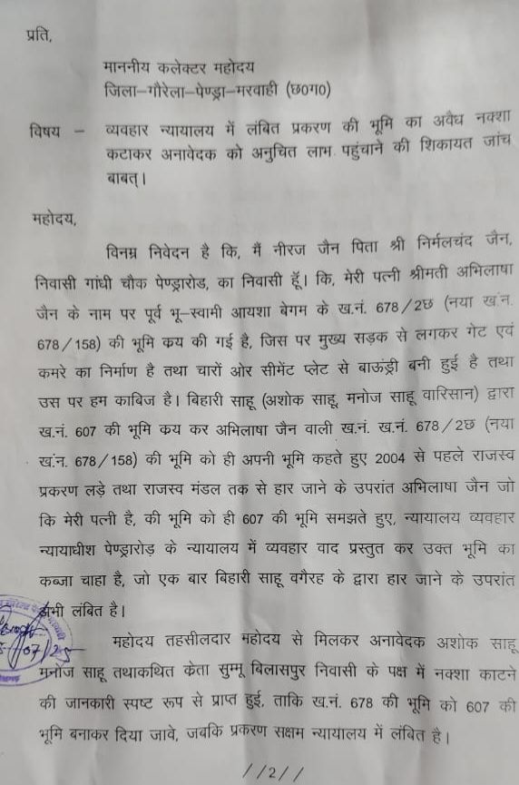 जीपीएम — जिला गौरेला पेंड्रा मरवाही के राजस्व विभाग में आय दिन किसी न किसी प्रकार के अनियमितता के मामले सामने आते ही रहते है हालही में गौरेला निवासी नीरज जैन ने जिले के पेंड्रारोड तहसील के तहसीलदार पर एक गंभीर आरोप लगाया है जिसकी शिकायत में उन्होंने बताया है कि उनके कब्जे के जमीन में किसी और व्यक्ति का नक्शा काटने का दबाव हल्का पटवारी पर तहसीलदार द्वारा मौखिक रूप से बनाया जा रहा है जबकि उक्त भूमि का मामला पहले ही व्यवहार न्यायालय में लंबित है