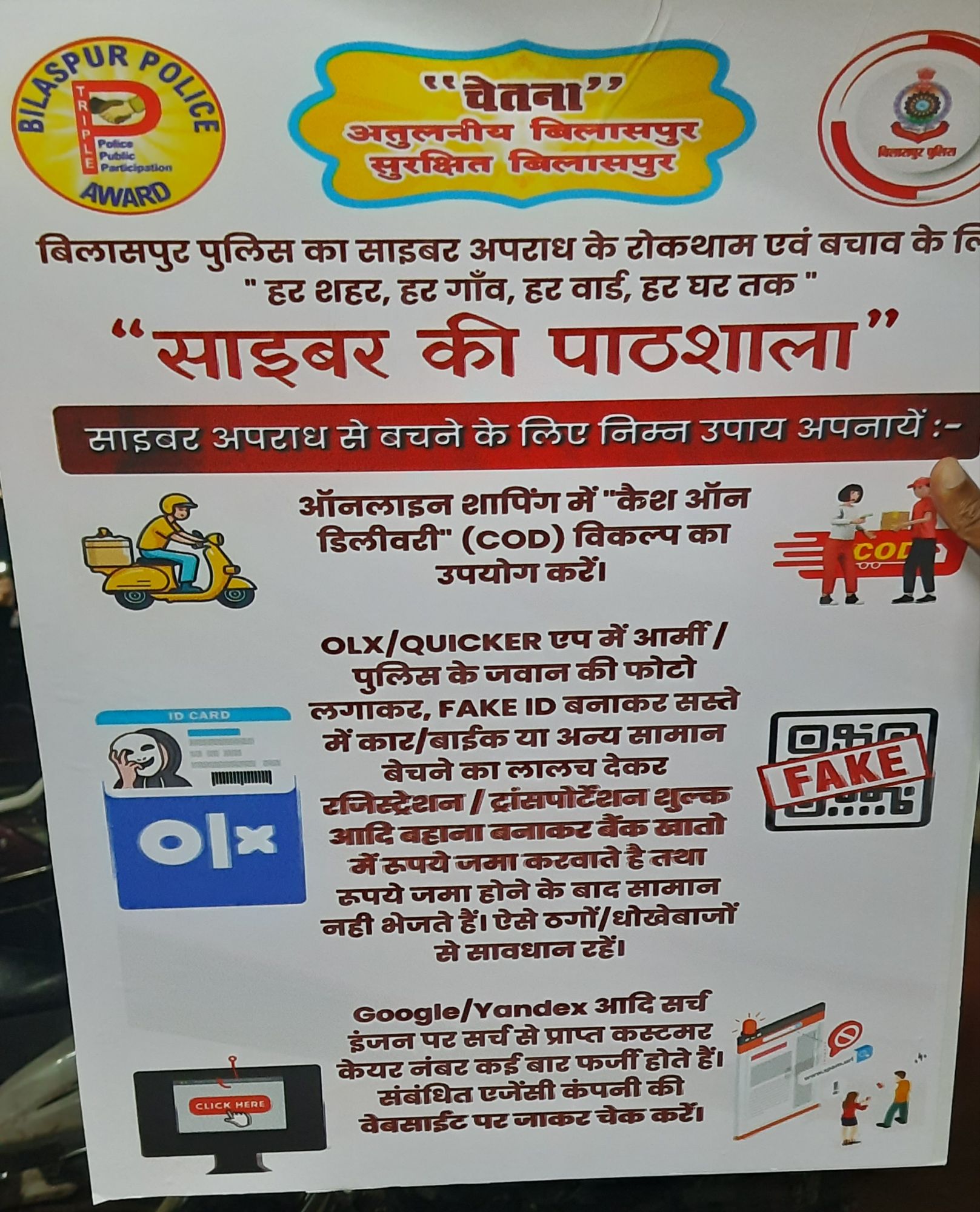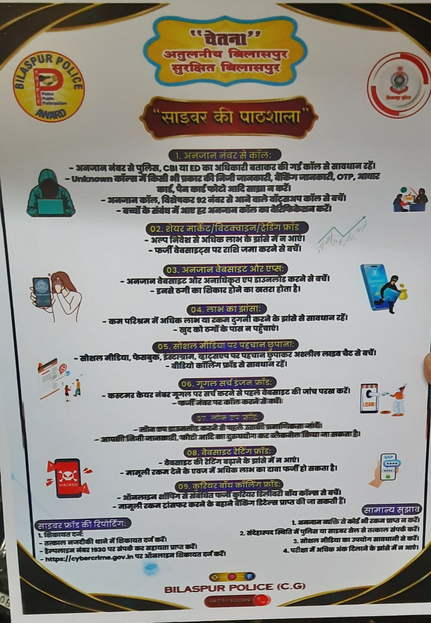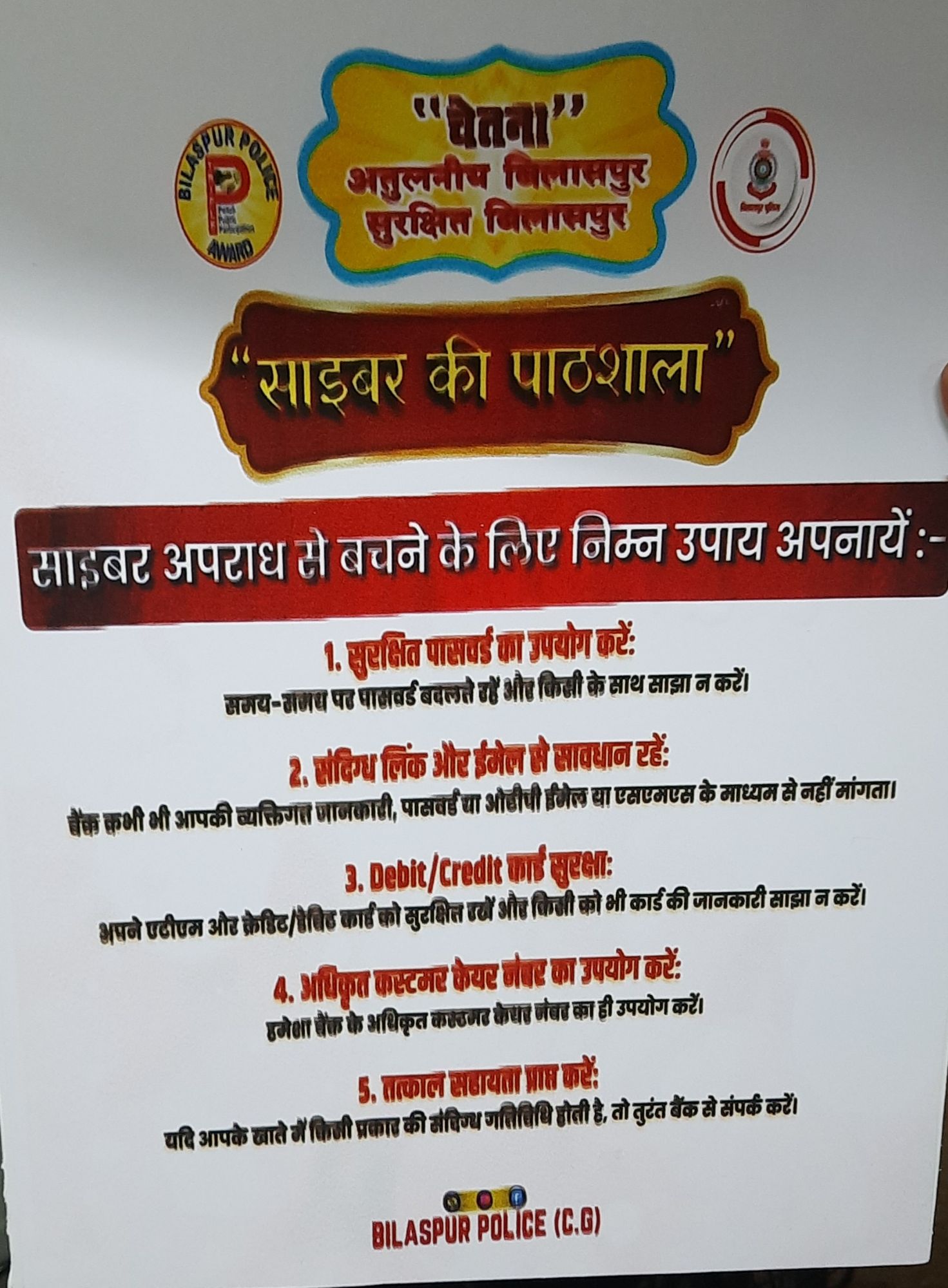 बिलासपुर जिले के मस्तुरी बस स्टैंड में साइबरजागरूकता चौपाल लगाया गया और साइबर अपराधों के सम्बन्ध में जागरूक किया गया।इस दौरान बिलासपुर एस पी रजनीश सिंह एवं थाना प्रभारी हरीश टांडेकर ने मस्तुरी बस स्टैंड में चौपाल लगाकर बताया कि साइबर ठग फर्जी बैंक कॉल,लॉटरी फॉड और सोशल मीडिया लिंक के जरिये लोगों को शिकार बनाते हैं।उन्होंने एटीएम पिन या ओटीपी साझा न करने की सलाह दी और संदेहास्पद स्थिति में तुरंत पुलिस से संपर्क करने को कहा। वहीं साइबर अपराध से बचाव के लिए आवश्यक दिशा-निर्देश दिए गए, जिसमें ATM कार्ड का प्रयोग करते समय अनजान व्यक्तियों से सहयोग लेने से बचने व अपने ATM पिन को छिपाकर प्रयोग करने से संबंधित जानकारी दी गई।