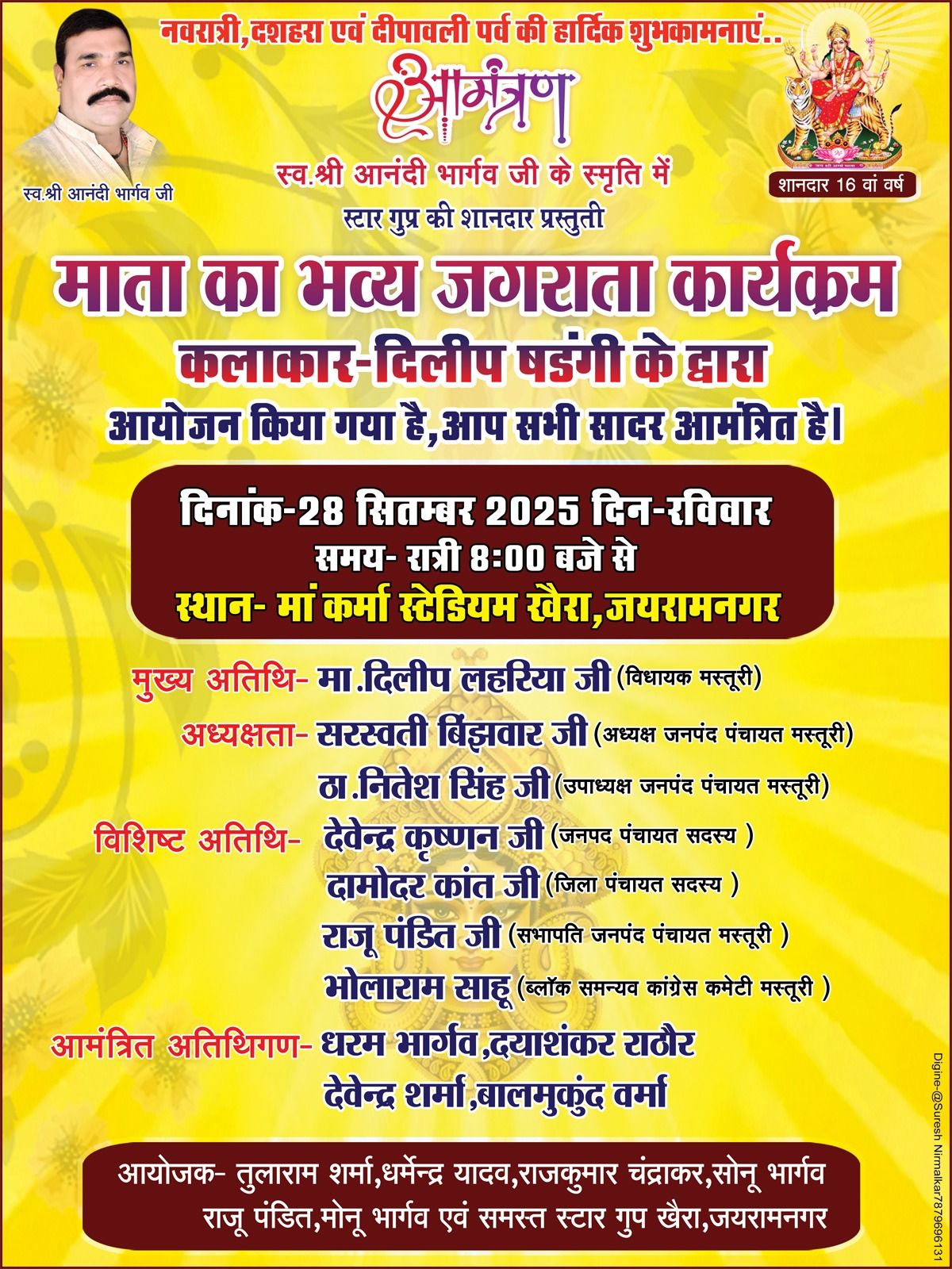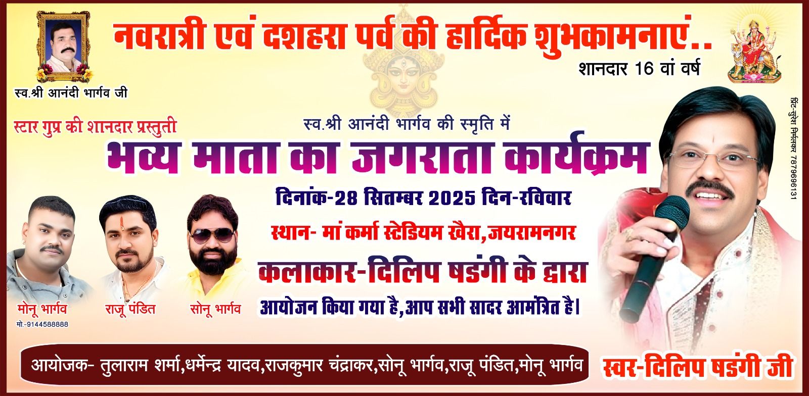 मस्तूरी। स्व.श्री आनंदी भार्गव के स्मृति में माता का भव्य जगराता कार्यक्रम का आयोजन मां कर्मा स्टेडियम खैरा जयरामनगर में 28 सितंबर रविवार को किया गया है। रात में माता का भव्य जगराता कार्यक्रम छत्तीसगढ़ की सुप्रसिद्ध भजन गायक दिलीप षंडगी की जसगीत भजनों की प्रस्तुति दी जाएगी।