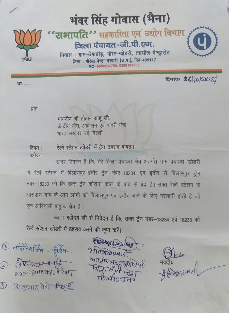 पंचायत के ग्रामीणों के द्वारा उनसे खोडरी रेल्वे स्टेशन पर इंदौर बिलासपुर–इंदौर के बीच चलने वाली नर्मदा एक्सप्रेस के ठहराव की माँग रखी जिससे कि लोगों को आवागमन में सुविधा मिल सके अभी नर्मदा एक्सप्रेस में सफर करने के लिए लोगों को पेंड्रा रोड रेल्वे स्टेशन जाना पड़ता है जो कि 30 से 50 किलोमीटर से भी अधिक दूर पड़ता है जिससे लोगों को काफी परेशानी का सामना करना पड़ता जनता की इस मांग पर संज्ञान लेते हुए